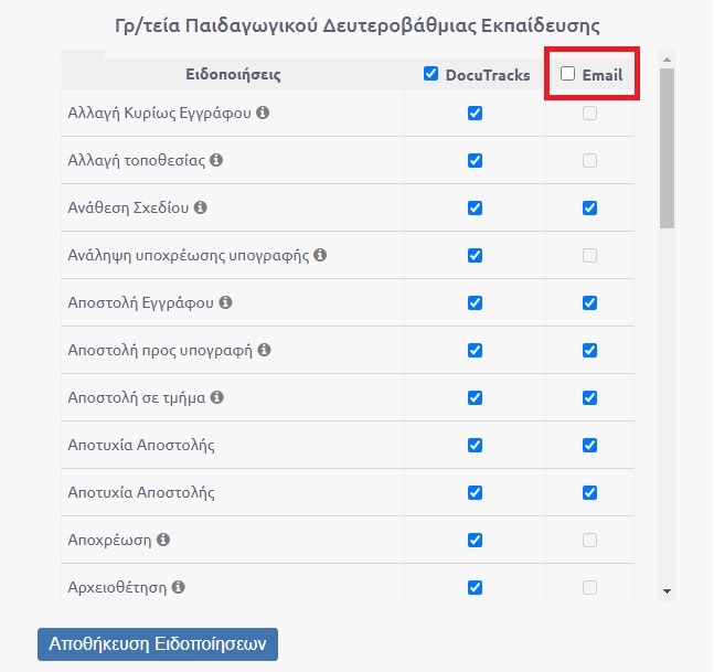 Εκεί εμφανίζονται οι ειδοποιήσεις για τα δύο είδη Docutracks και Εmail ανά ενέργεια. Βλέπουμε και τις ενέργειες Αποστολή Εγγράφου/Γνωστοποίηση Εγγράφου. Επιλέγοντας για παράδειγμα το Εmail μπορούμε να παίρνουμε email για όλα τα συμβάντα (μαζική ενεργοποίηση).