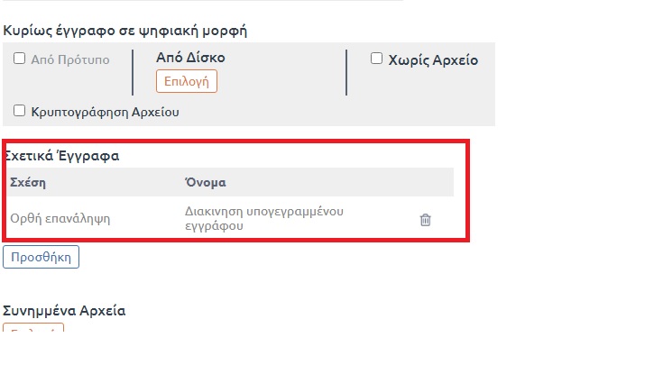 4. Το νέο έγγραφο δεν περιέχει κανένα αρχείο, συνεπώς ανεβάζουμε τα σωστά αρχεία από την αρχή -κύριο έγγραφο σε ψηφιακή μορφή και τυχόν συνημμένα. Στη συνέχεια ΑΠΟΘΗΚΕΥΣΗ.