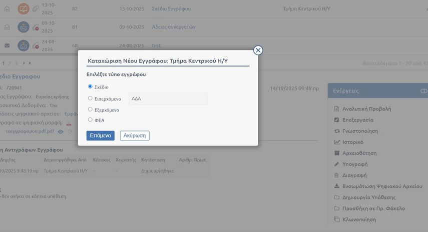 1. Ως ο συντάκτης του εγγράφου ανοίγουμε ένα νεό έγγραφο ΣΧΕΔΙΟ - επιλογή ΣΧΕΔΙΟ- με το ΘΕΜΑ του και ανεβάζουμε το ΨΗΦΙΑΚΟ ΑΡΧΕΙΟ όπως στην περίπτωση του εξερχομένου εγγράφου.