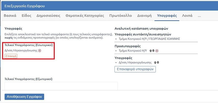 Εκεί προσδιορίζουμε την Μονάδα της τελικής υπογραφής π.χ μπορεί να είναι το Τμήμα ή Γραμματεία που ανήκουμε ή ακόμα ανώτερη μονάδα π.χ η Δ/νση μας (στο παράδειγμά η Δ/νση Μηχανοργάνωσης). Αυτόματα υπολογίζονται και τυχόν συνυπογραφές που είναι προαιρετικές, μπορούμε να τις αφαιρέσουμε.